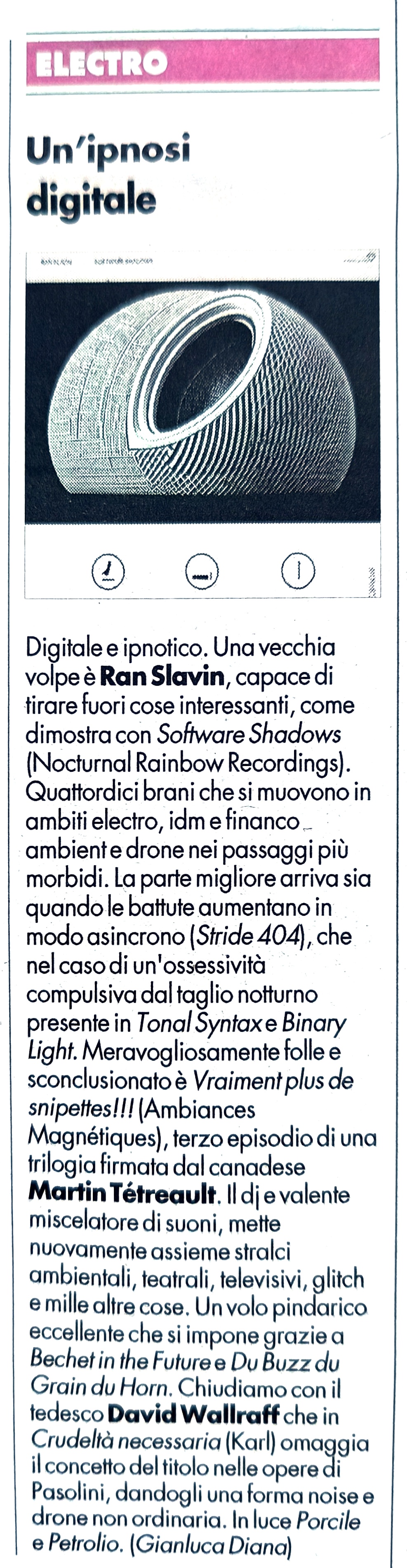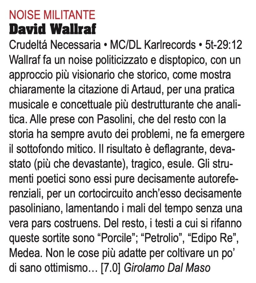 „Eschewing the genre tendency to lean on longer pieces and drawn out phrases, Crudeltá Necessaria moves forward quickly and with determination to bring David Wallraf’s commentary to light. Using noise, samples, field recordings, and a sense of disquiet, the message of the album is undeniably brought to the surface. Whether one is familiar with Pier Paolo Pasolini or not, this album certainly speaks to cruetly and violence, even if tangentially, through its sonic shouts. Never getting overly oppressive, Crudeltá Necessaria is a fantastic piece of smart, rough electronics.“
